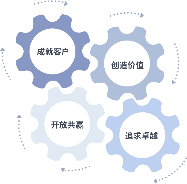成就客户是一切决策的出发点,,创造价值是衡量所有工作的标准,,追求卓越是我们做事做人的态度,,,开放共赢是我们的格局也是最终的结果。。。。价值观的齿轮环环相扣,,,推动着组织里的每个人不断向前。。。